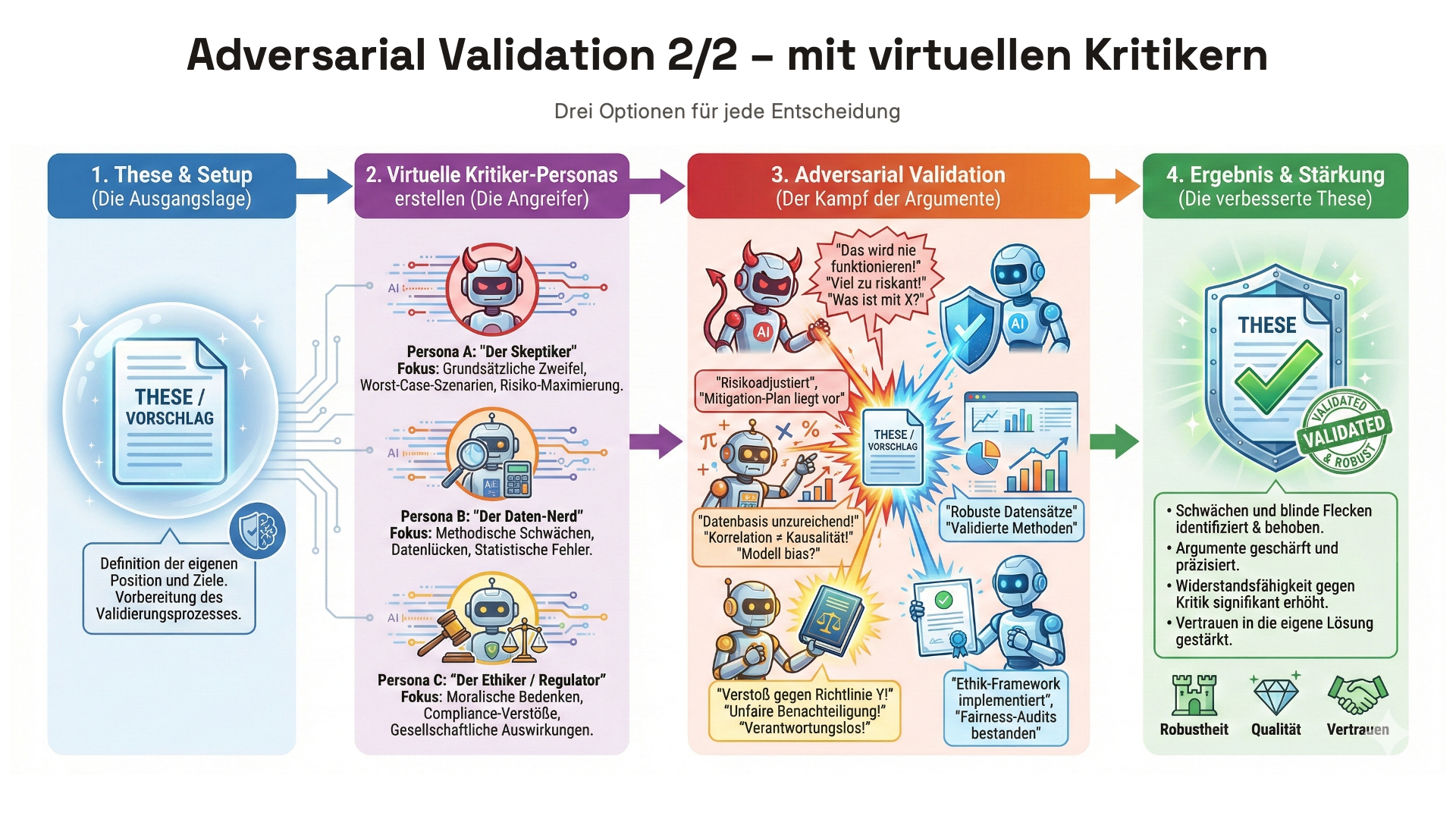 Adversarial Validation – Drei virtuelle Kritiker prüfen jede Entscheidung auf blinde Flecken.